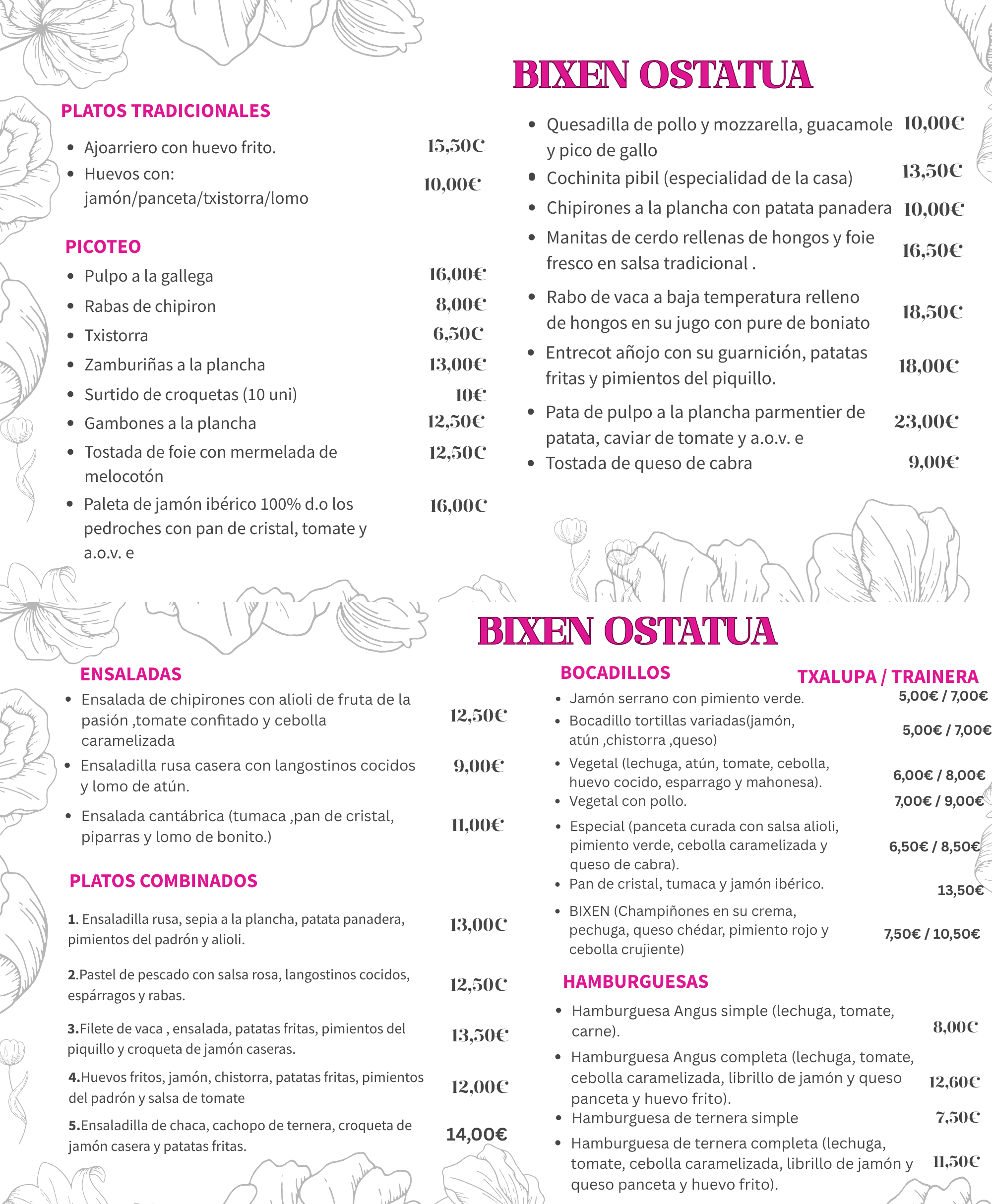 Bienvenidos a Bixen Ostatua, un rincón tranquilo entre semana y el lugar de encuentro local los fines de semana. Disfruta de nuestra cocina casera, pintxos tradicionales, y platos de la zona en un ambiente acogedor. Desde nuestras tapas y hamburguesas, te esperamos en nuestra terraza cubierta para compartir buenos momentos